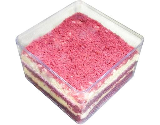 A moist and creamy red velvet cake in a container.